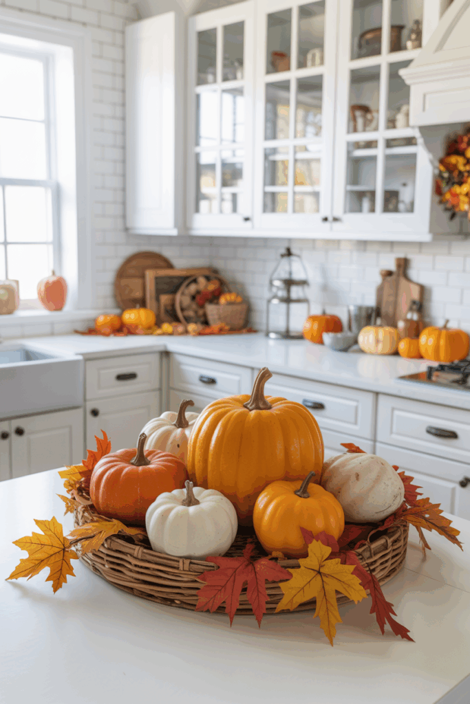 If you prefer a neutral palette, look for white or muted green pumpkins that still feel seasonal but won’t compete with your kitchen’s existing colors.