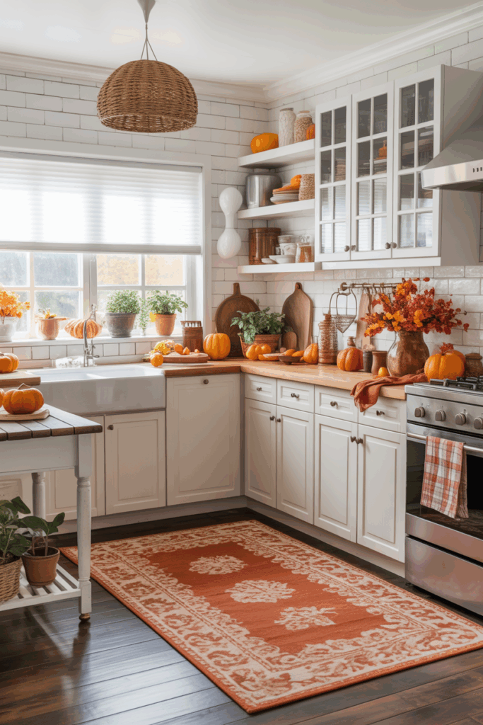Add a cozy washable rug in front of the sink or stove. Choose patterns with fall colors, plaid designs, or earthy tones that add comfort and seasonal style.