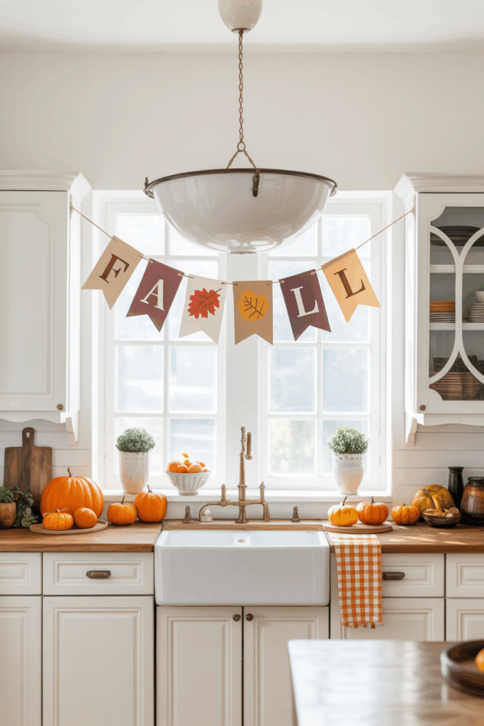 Add a fabric or burlap fall banner to your kitchen window, backsplash, or even over your stove. Choose one that says “Hello Fall,” “Thankful,” or features mini pumpkins or leaves.