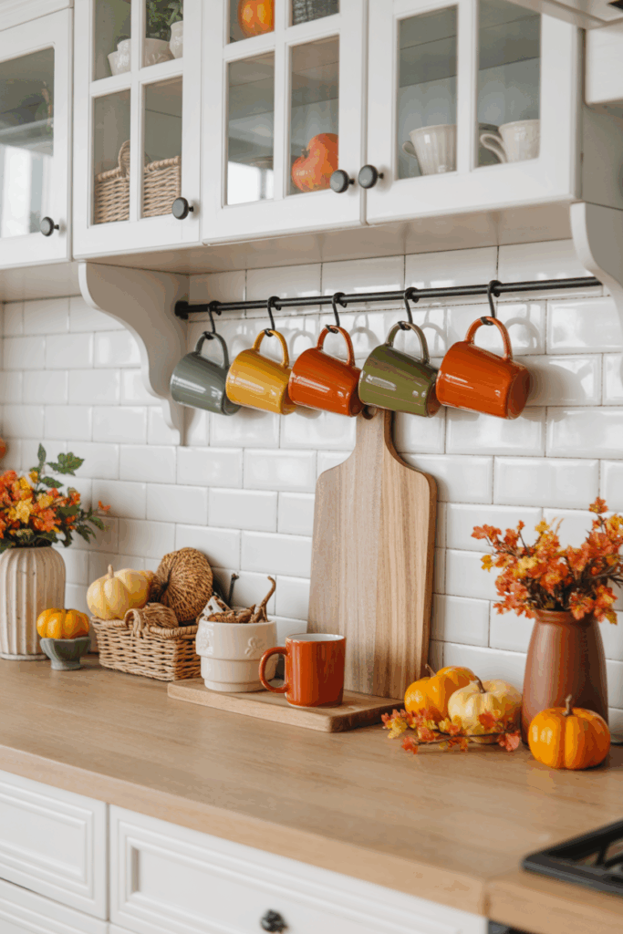Display seasonal mugs on a hanging rack or open shelf. Mix classic pumpkin-themed mugs with plain orange or beige ones for variety.