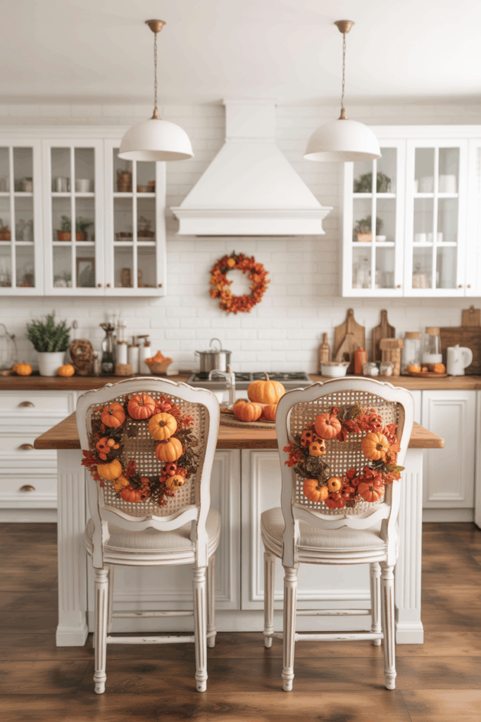 The backs of your bar stools or kitchen chairs are often overlooked, but they’re actually the perfect blank canvas for adding a subtle yet charming touch of fall décor. Simple additions like plaid bows, burlap ribbons, or mini wreaths instantly bring seasonal warmth to your seating area without cluttering your counters. Choose colors and textures that complement the rest of your kitchen—think warm oranges, golden yellows, rich browns, or rustic neutrals.