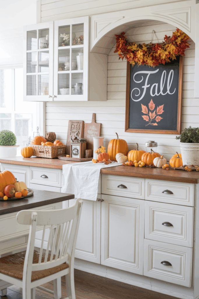 Chalkboards are one of the easiest and most versatile ways to add personality to your fall kitchen décor. A small framed chalkboard can be propped on a counter, hung above a coffee bar, or mounted on the wall as a central seasonal feature. Use it to write warm, welcoming messages like “Hello Fall,” “Pumpkin Spice Season,” or “Gather & Give Thanks.”These little touches instantly make your kitchen feel festive and inviting.