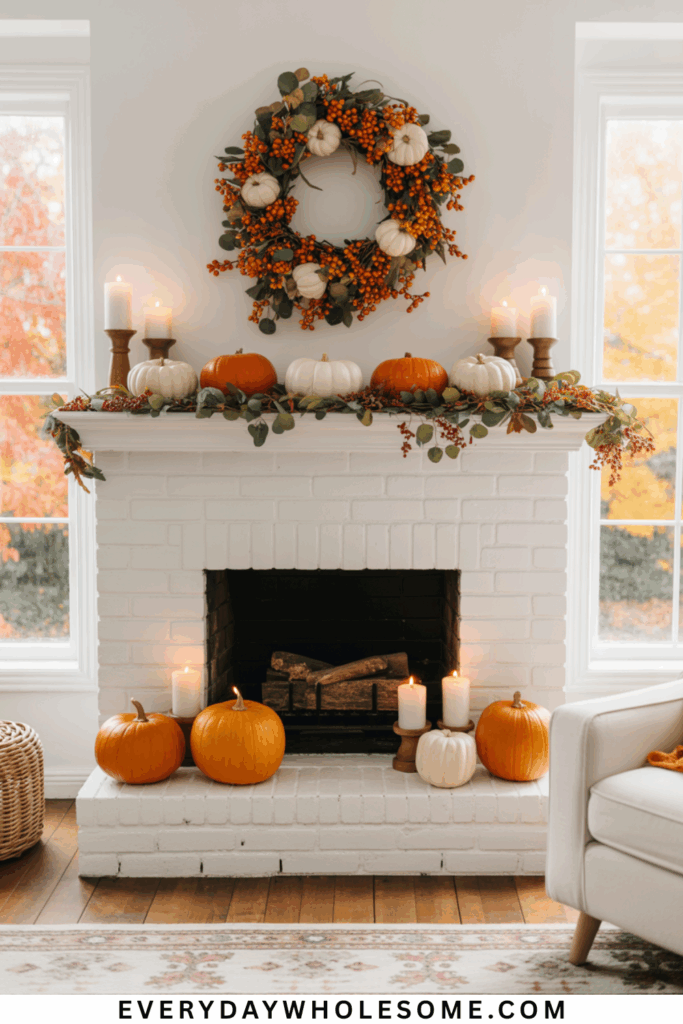 This mantel idea uses pumpkins paired with candles for a simple, warm look. Amber-colored glass bottles or candle holders add subtle richness without overwhelming the space.