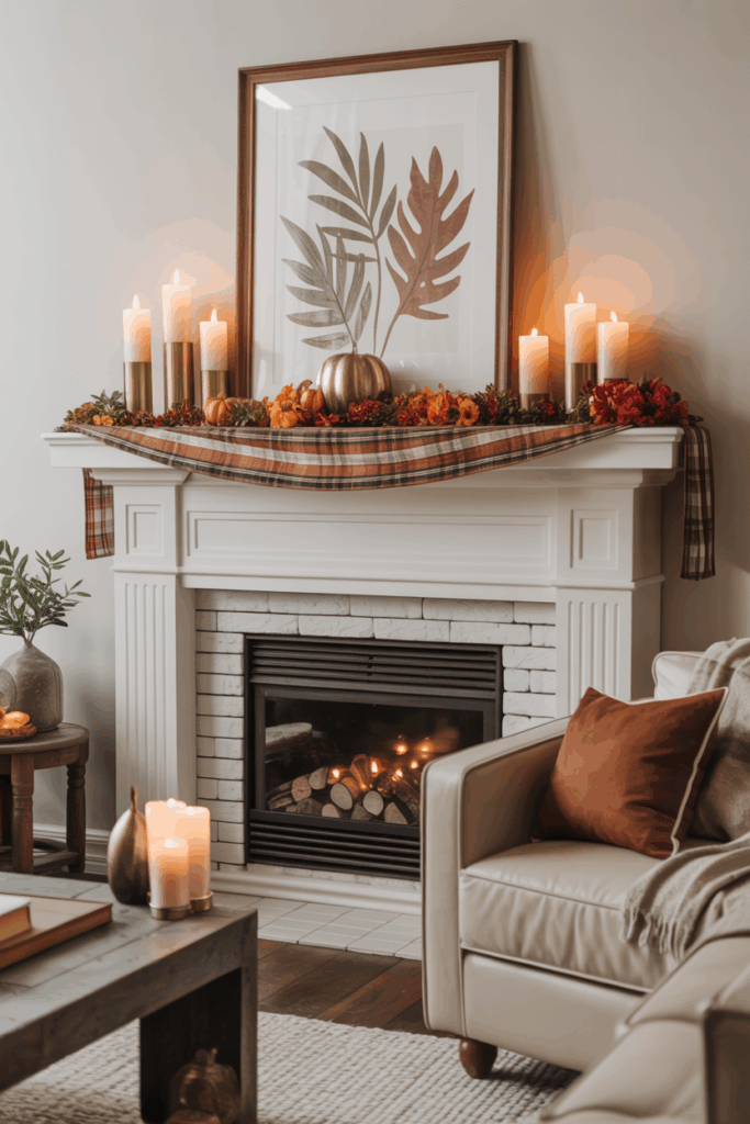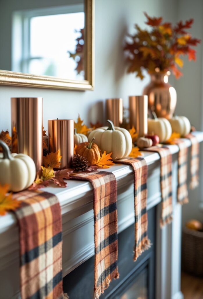 Plaid fabric runners add warmth and texture to fall mantels. They create a cozy base that complements seasonal decor.