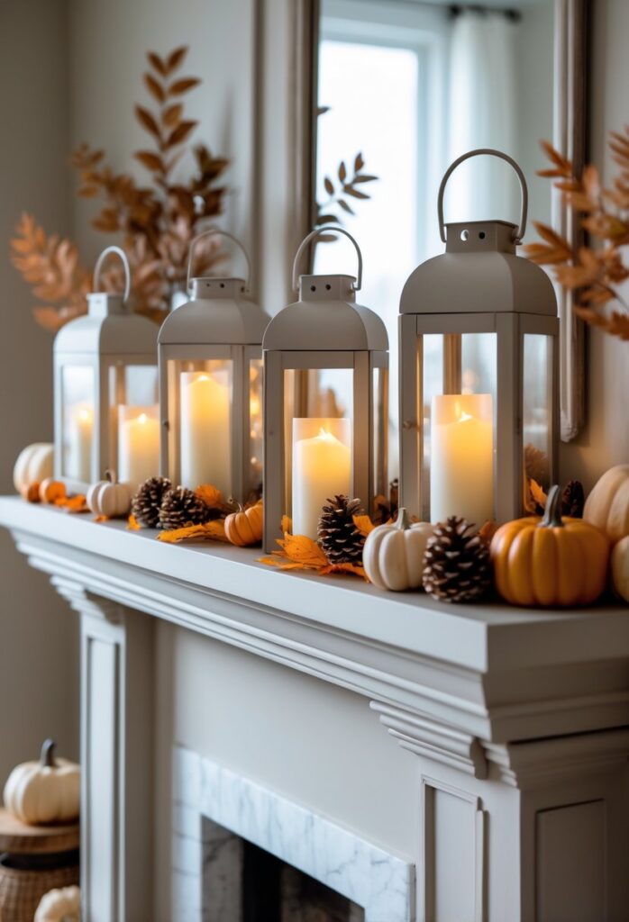 Neutral-toned lanterns offer a simple yet elegant addition to any fall mantel. Their muted colors blend well with seasonal decor without overpowering other elements.