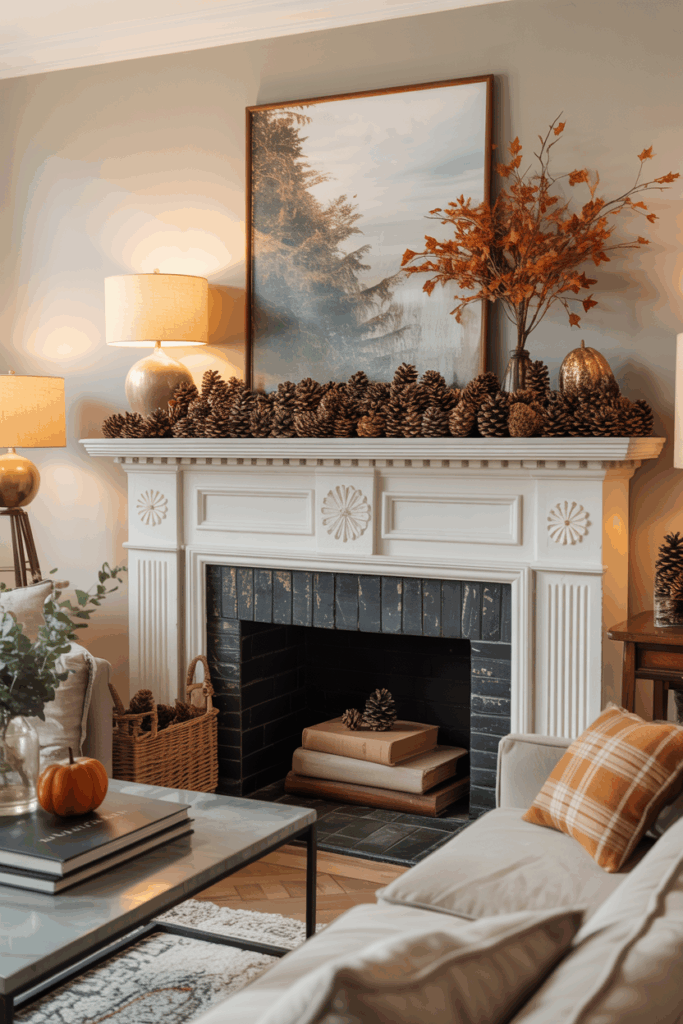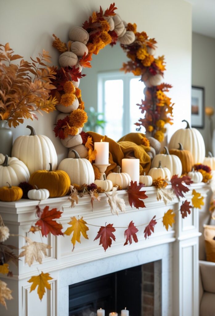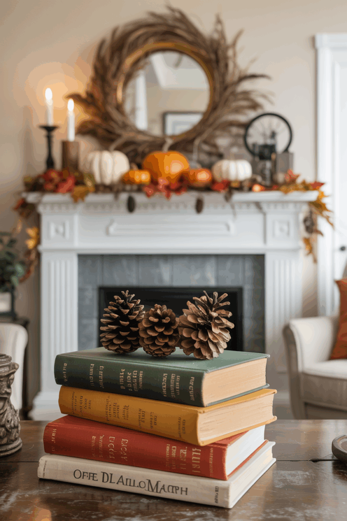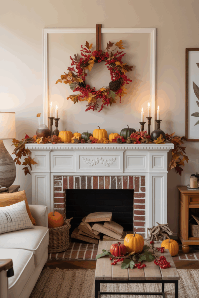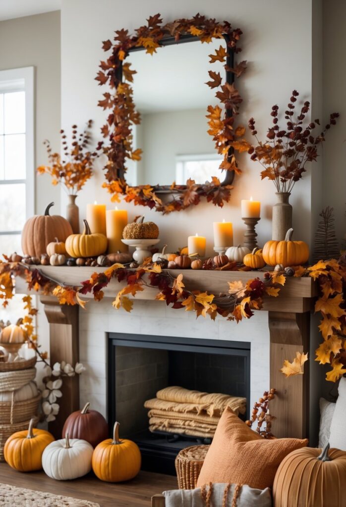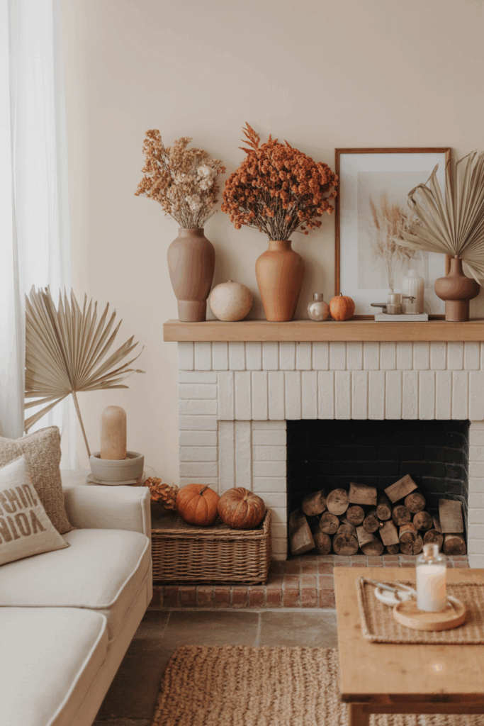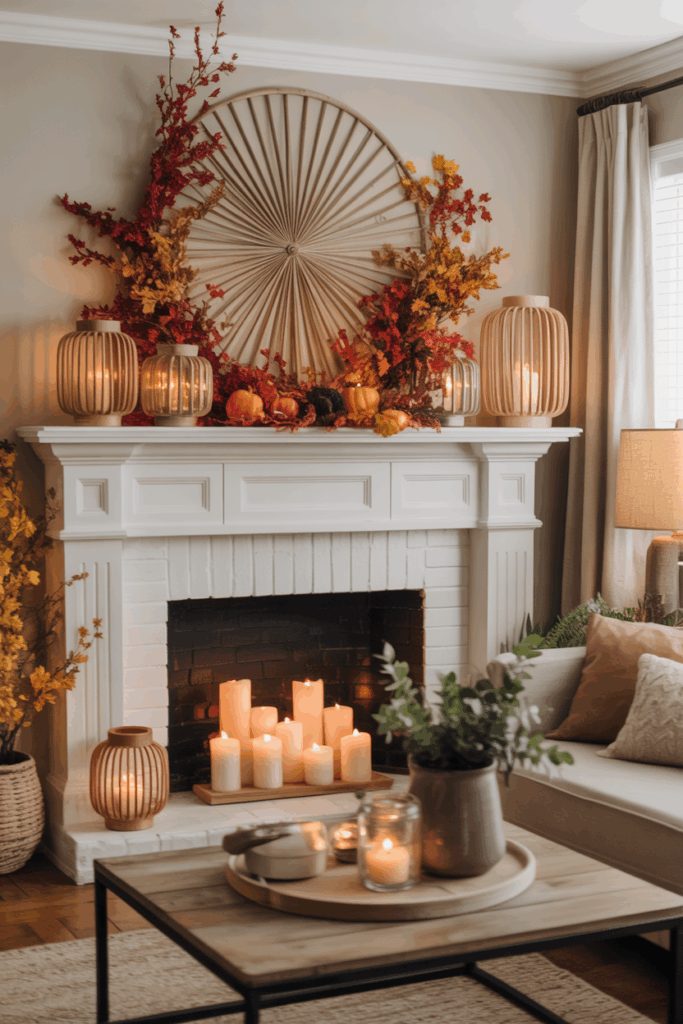 Adding a few small pumpkins or dried seed pods nearby can enhance the seasonal look. The layers draw the eye and make the mantel inviting.