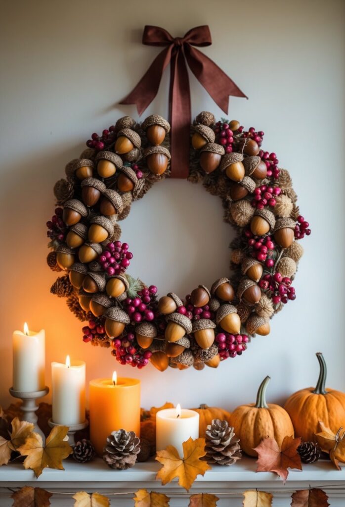 An acorn and berry wreath adds natural texture to a fall mantel. Its earthy tones complement warm seasonal colors like deep reds and burnt oranges.