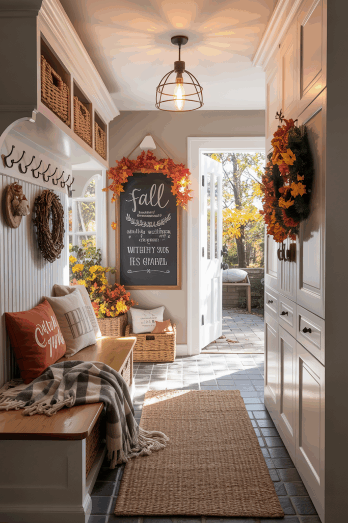 Letter boards or chalkboards are a fun way to change up your mudroom decor throughout the year. In the fall, use them to display quotes like “Welcome Fall,” “Pumpkin Spice Everything,” or “Grateful Hearts Gather Here.” These boards work well above hooks, on shelves, or leaning casually on a console table. You can even use them to leave notes for family or track the school week.