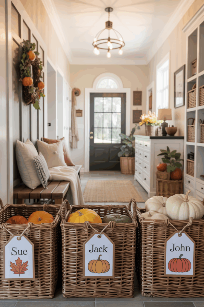 Label storage baskets with seasonal flair by adding fall-themed tags or tie-on labels. Use kraft paper tags with little pumpkin cutouts or chalkboard labels written in fall-colored chalk. This is both practical and cute, especially if each family member has their own storage bin.