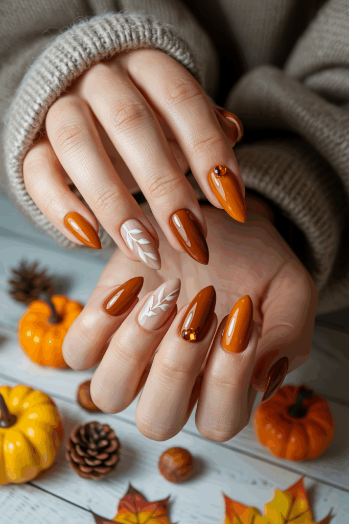 Pumpkin-inspired nails are festive yet versatile, making them a standout choice for the season. The glossy finish adds a celebratory feel, perfect for Thanksgiving or Halloween-inspired styles.