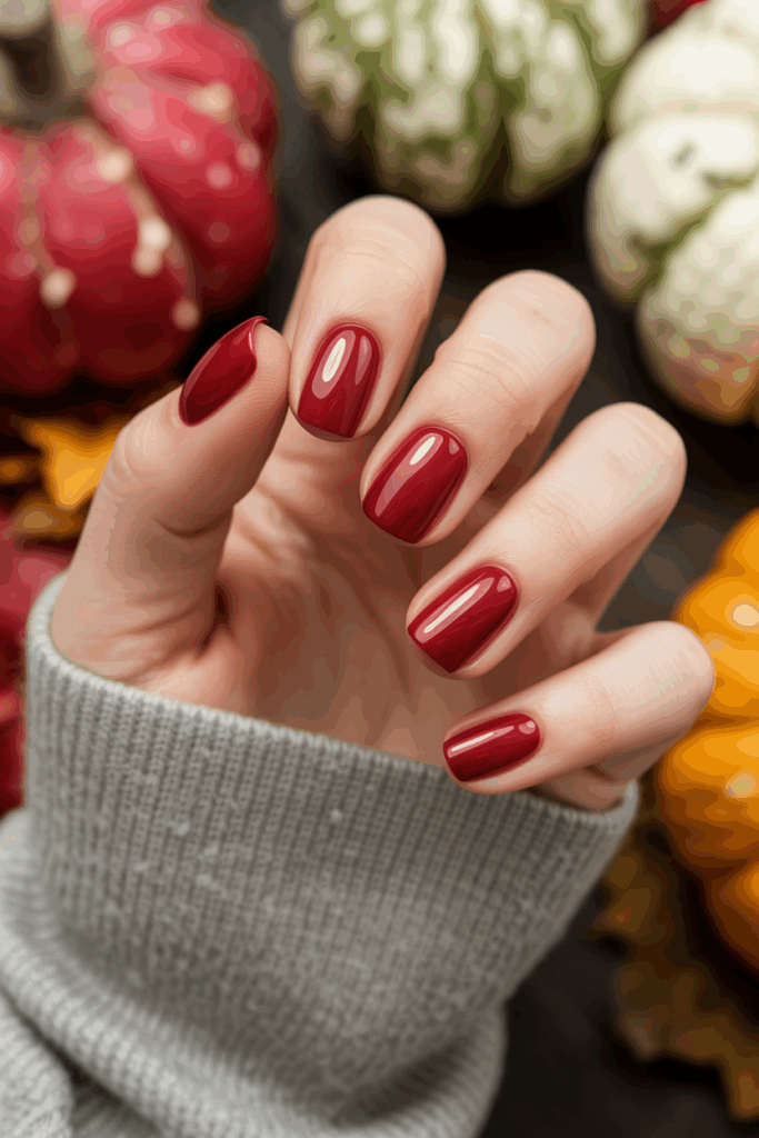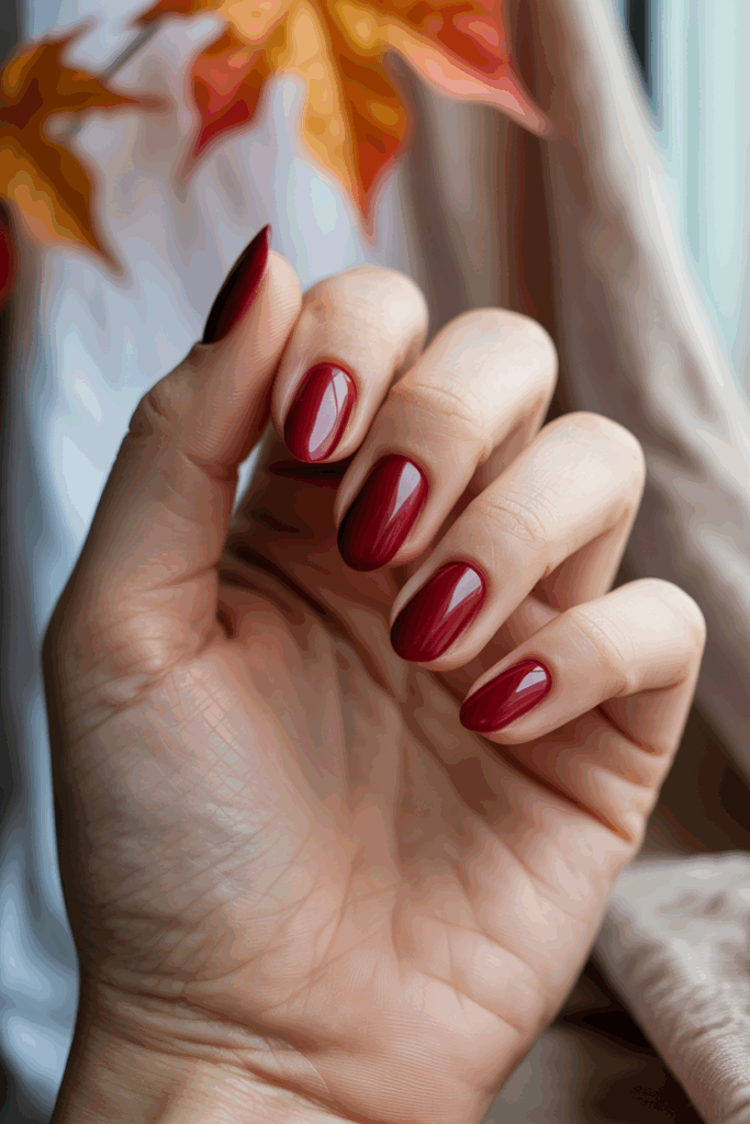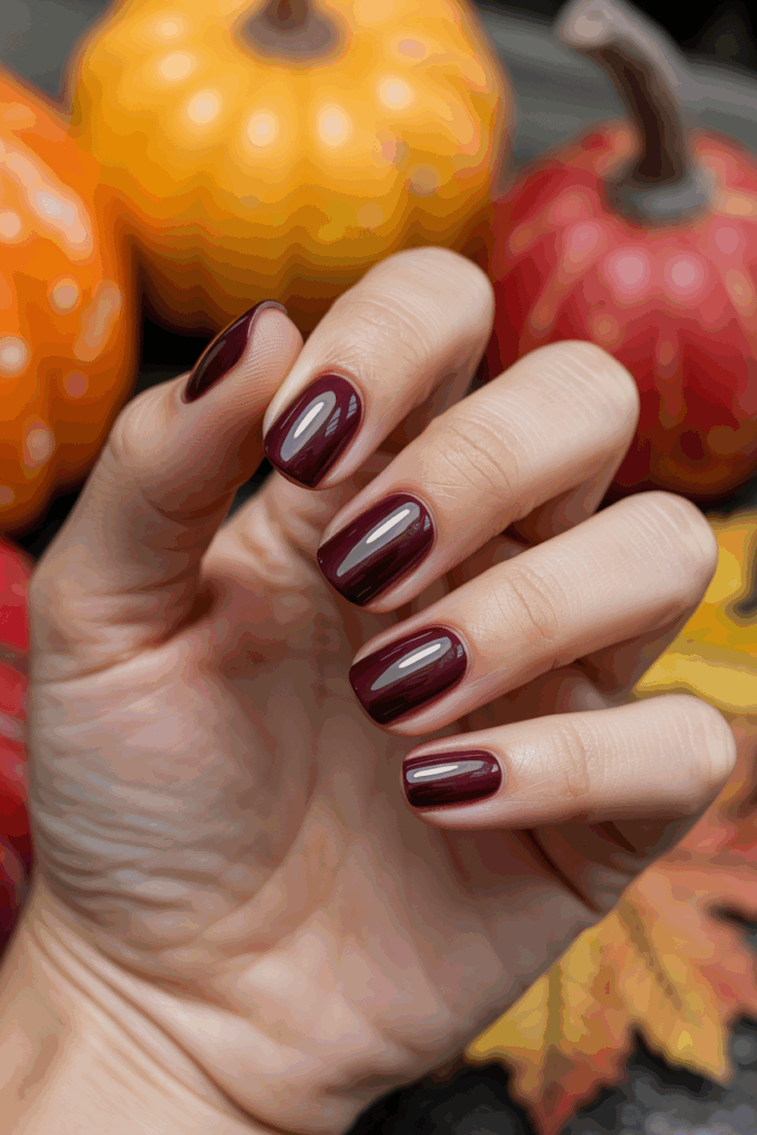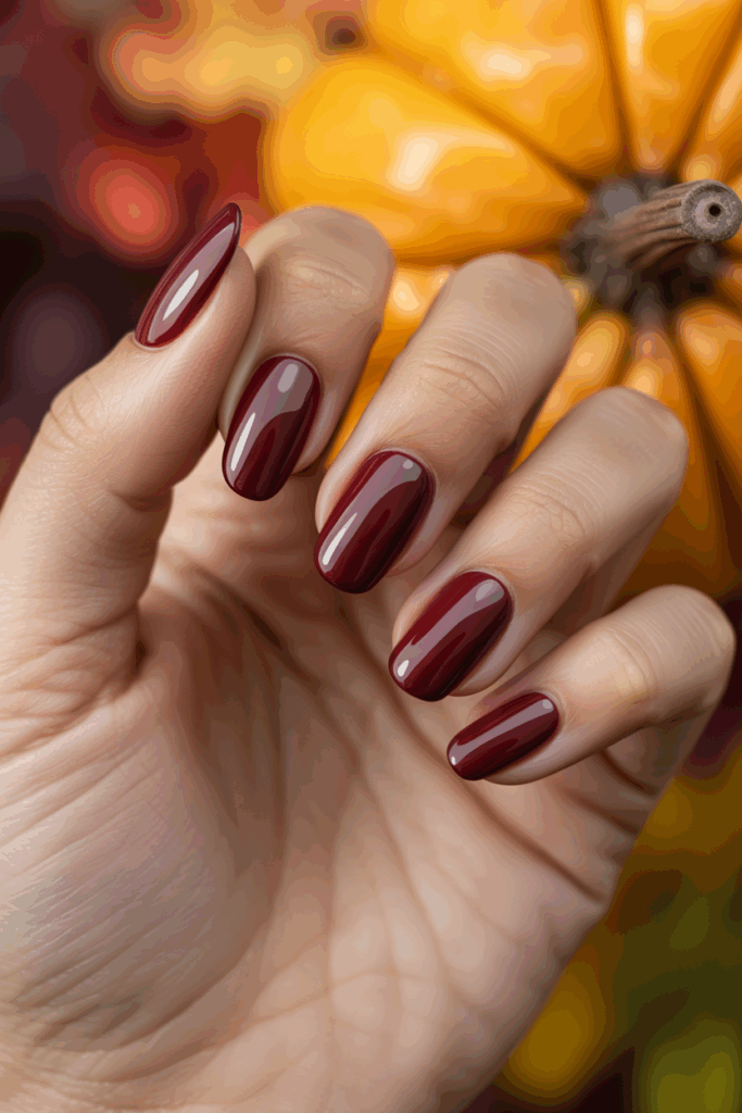 Deep burgundy is one of the most timeless fall nail polish colors, offering a rich, luxurious shade that instantly feels warm and sophisticated. The deep red undertone works beautifully with autumn outfits, from cozy sweaters to elegant evening looks. It’s also one of the most versatile autumn nail ideas, flattering almost every skin tone and pairing easily with neutral accessories or bold statement pieces.