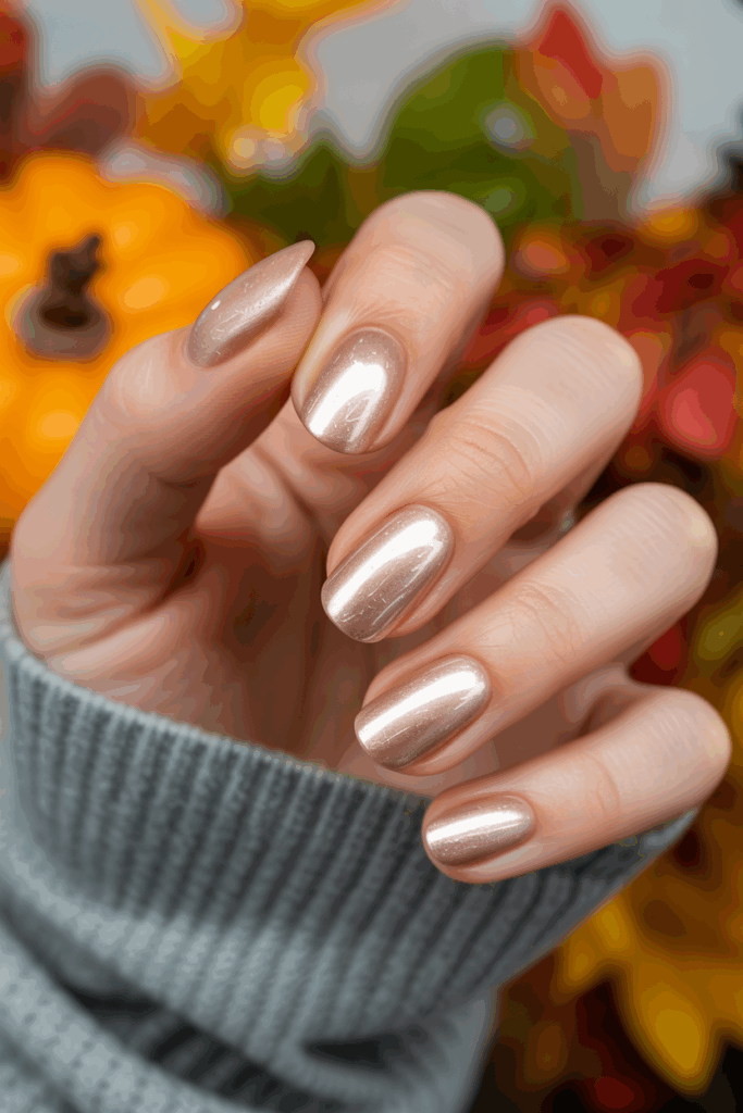 Champagne nails add a delicate, sparkling touch to fall styles. This pale metallic shade offers elegance without being too bold.