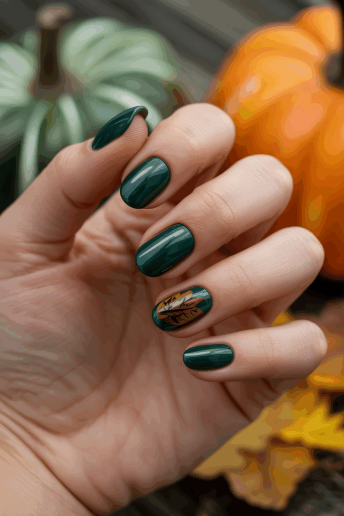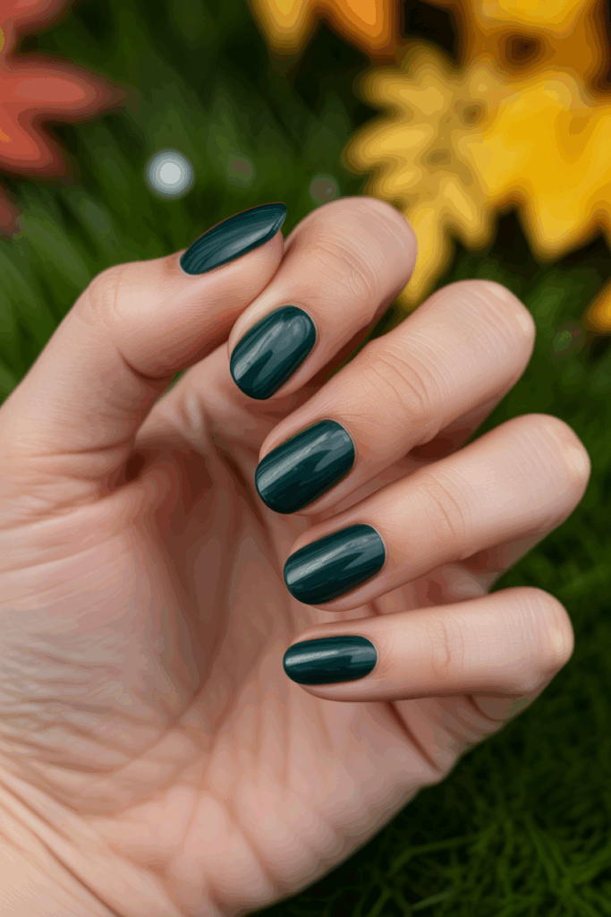 Glossy forest green nails offer a deep, rich color perfect for fall. The shine adds a polished look that works for both casual and formal styles. It pairs well with other autumn shades like gold and brown.