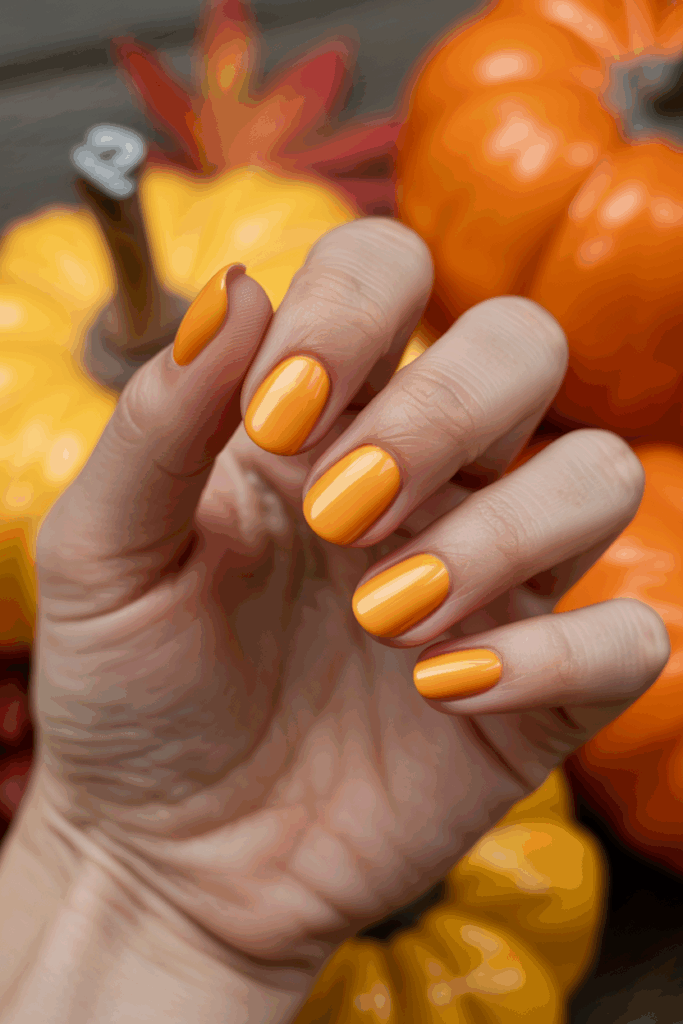 Glossy marigold nails stand out on their own, but they also pair beautifully with rust or burgundy for creative designs. It’s a fun way to brighten your fall manicure.