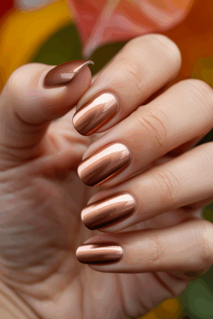 Metallic copper is a popular choice for fall nails. It offers a warm, shiny look that fits the season well. This color adds a modern twist with its reflective, metal-like finish. It pairs nicely with deep browns and neutral shades.