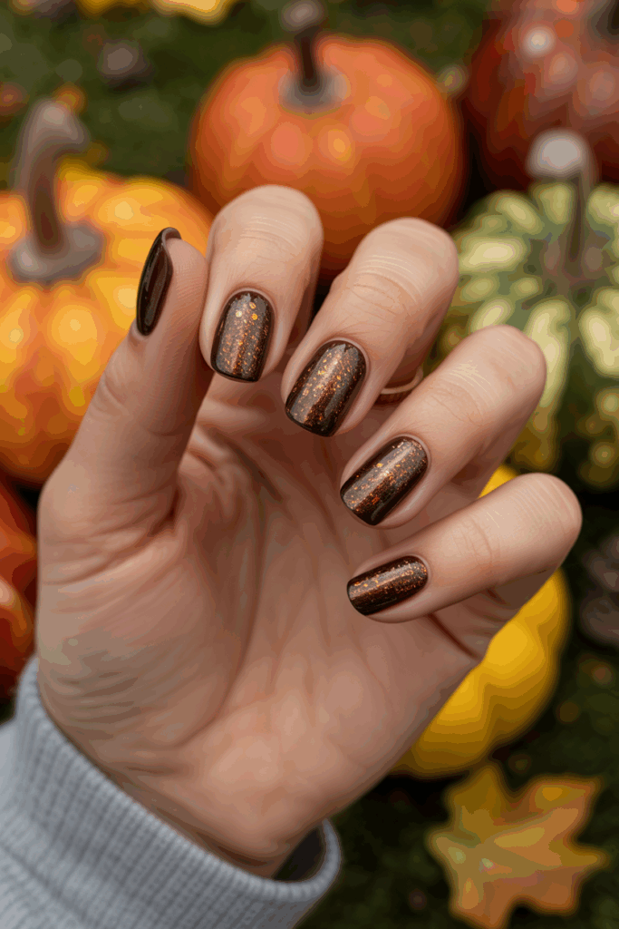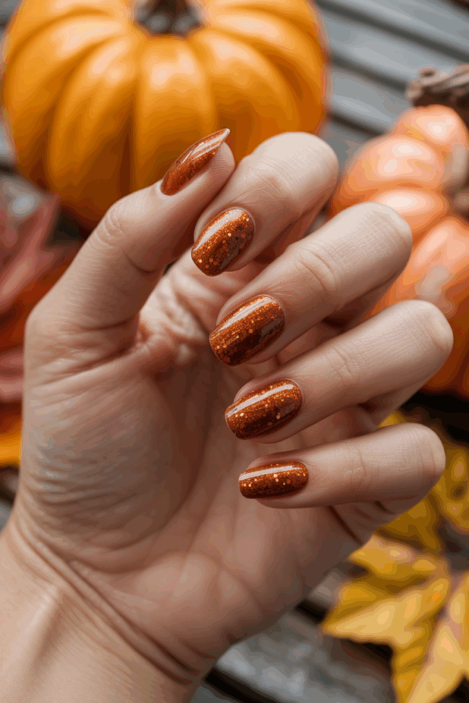 Bronze sparkle nails are a great way to add festivity to your look without overwhelming your style. The shimmer feels seasonal and celebratory, making it perfect for autumn events.