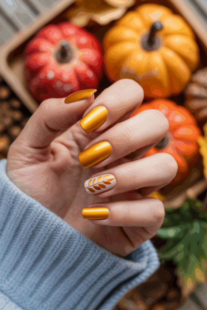 The satin gold accent adds a smooth, subtle shine to fall nail designs. It works well with warm tones like brown, orange, and deep red. This finish is elegant without being too flashy, offering a refined look for autumn nails.