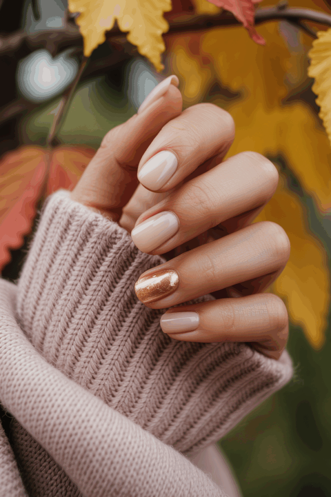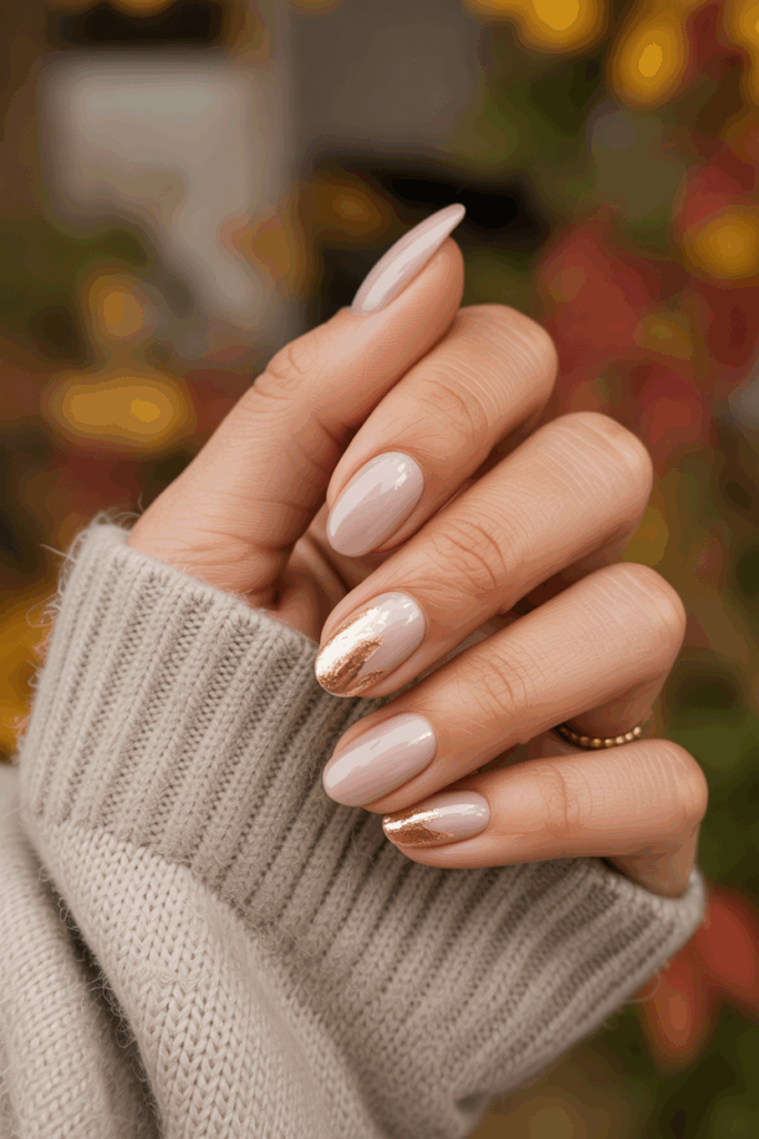 This look pairs a soft nude base with delicate gold foil accents. It adds a simple touch of shine without being too bold.
