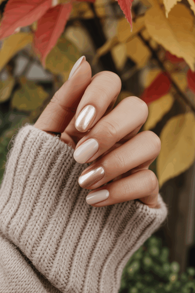 Copper metallic nails offer a sleek and modern look for fall. The shiny finish catches light and adds a rich, warm tone.