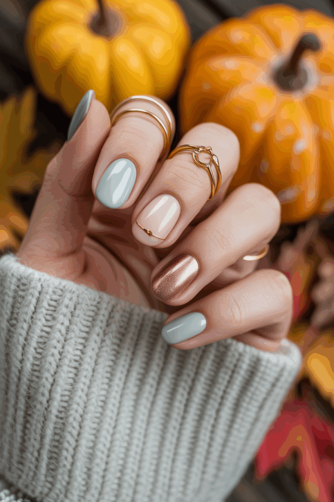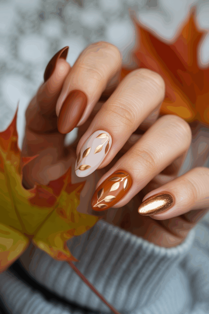 Soft latte hues bring a warm, neutral look to fall nails. These shades blend light browns and creams for a calm, polished style. They work well alone or layered for a subtle, elegant effect this season.