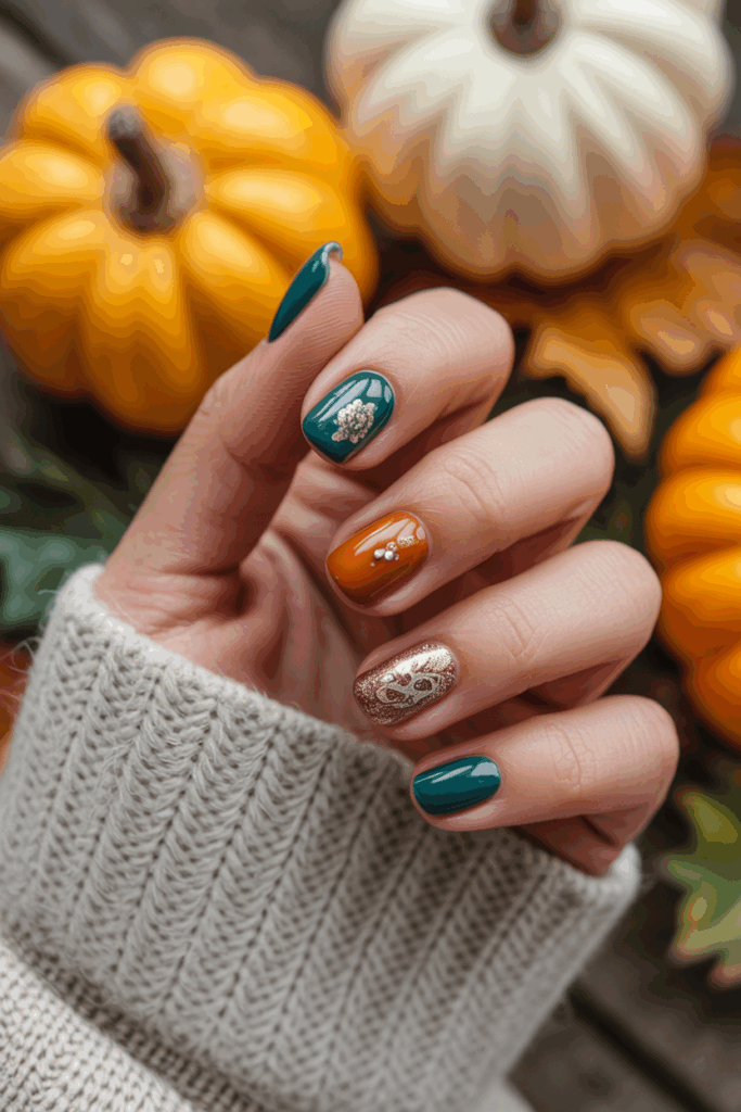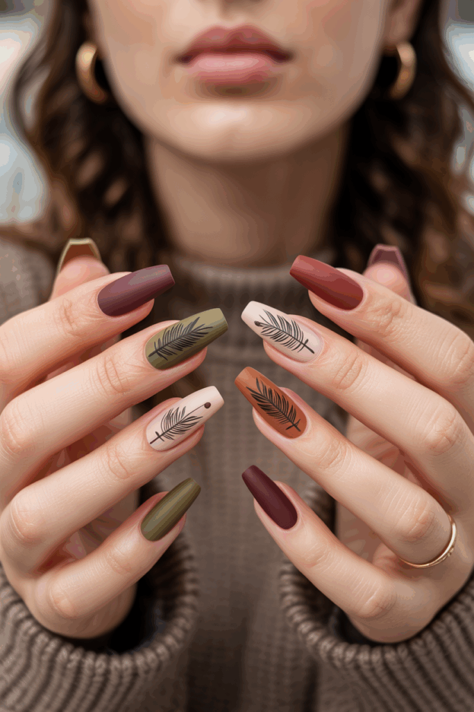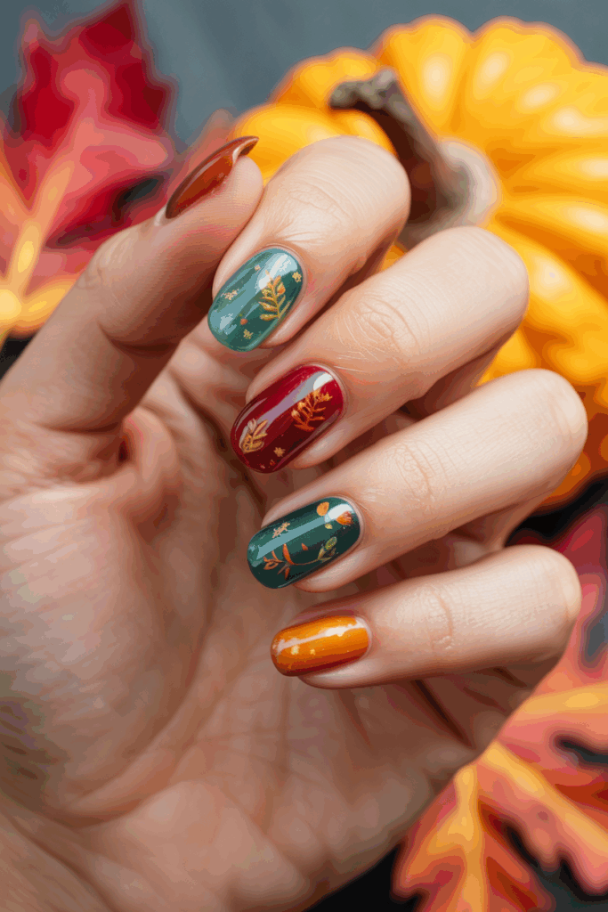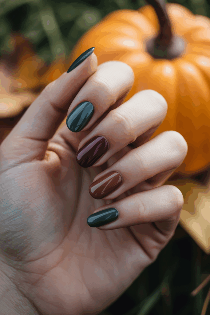 Earthy green nails use tones like olive, moss, and sage. These shades reflect the colors found in nature during fall.