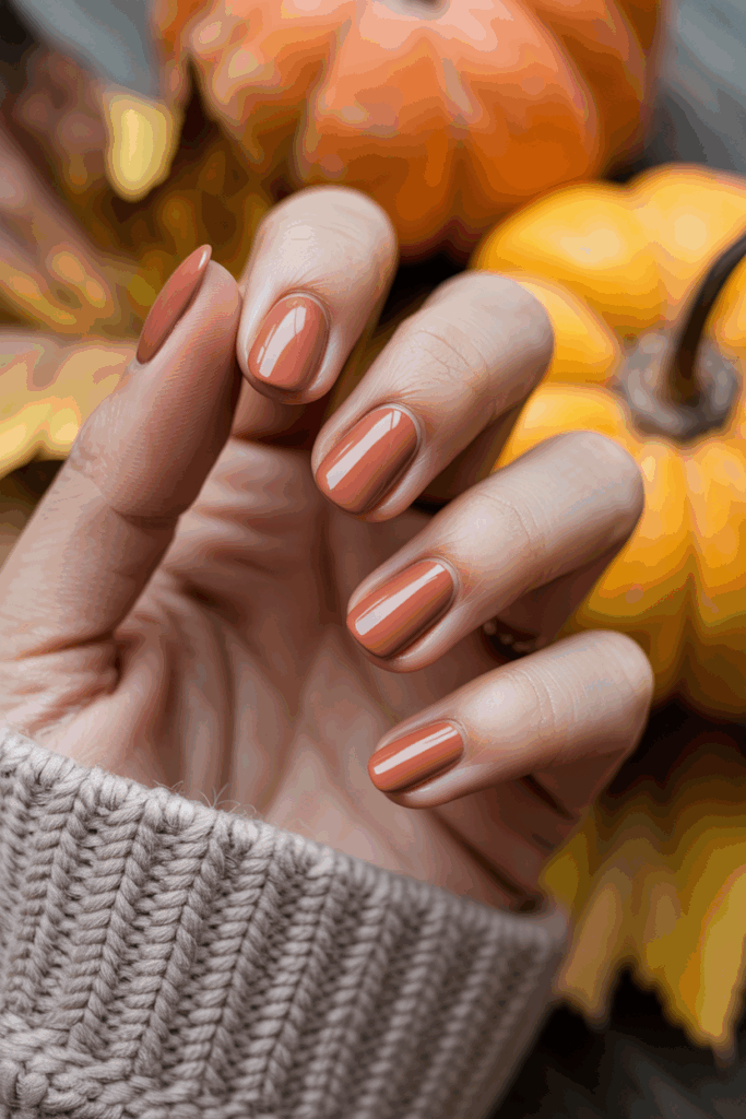 Muted terracotta nails offer a warm, earthy tone perfect for fall.