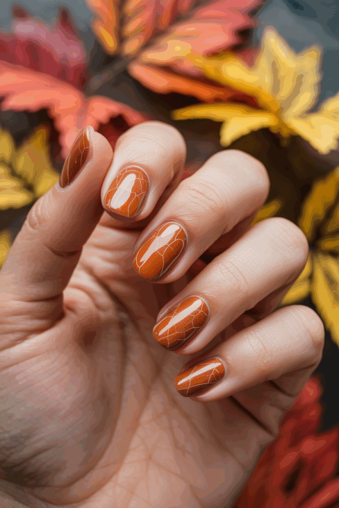 Okay, so this one just feels like fall. Think of that soft caramel latte color that shows up in every café once September hits — that’s the vibe here. A warm caramel polish with a creamy finish looks really natural on most skin tones, and it has that cozy, knit-sweater energy without being too loud. If you want to dress it up, add a matte top coat (it instantly makes it feel more expensive), or do one accent nail with a subtle sweater-texture stamp.