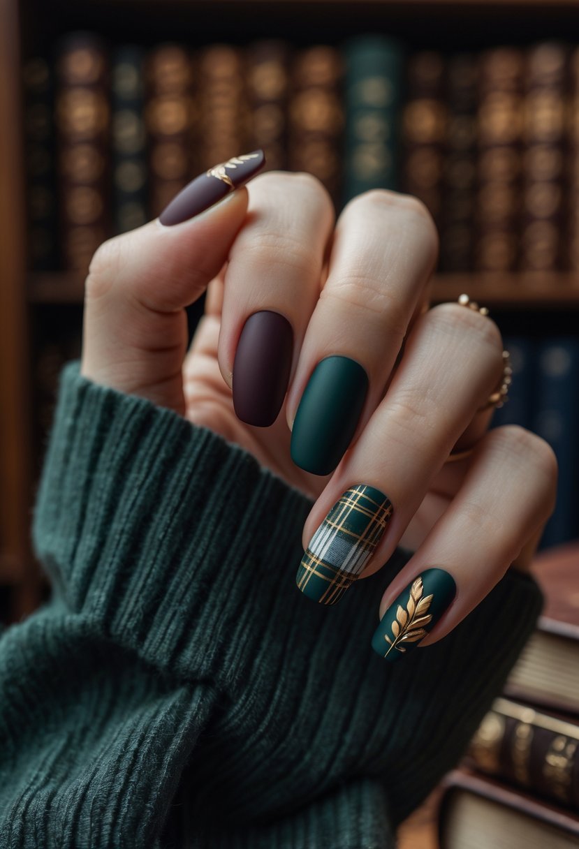 Dark-academia nails focus on deep, muted colors like dark browns, forest greens, and rich burgundies. They often include simple, classic designs like stripes or plaid patterns.