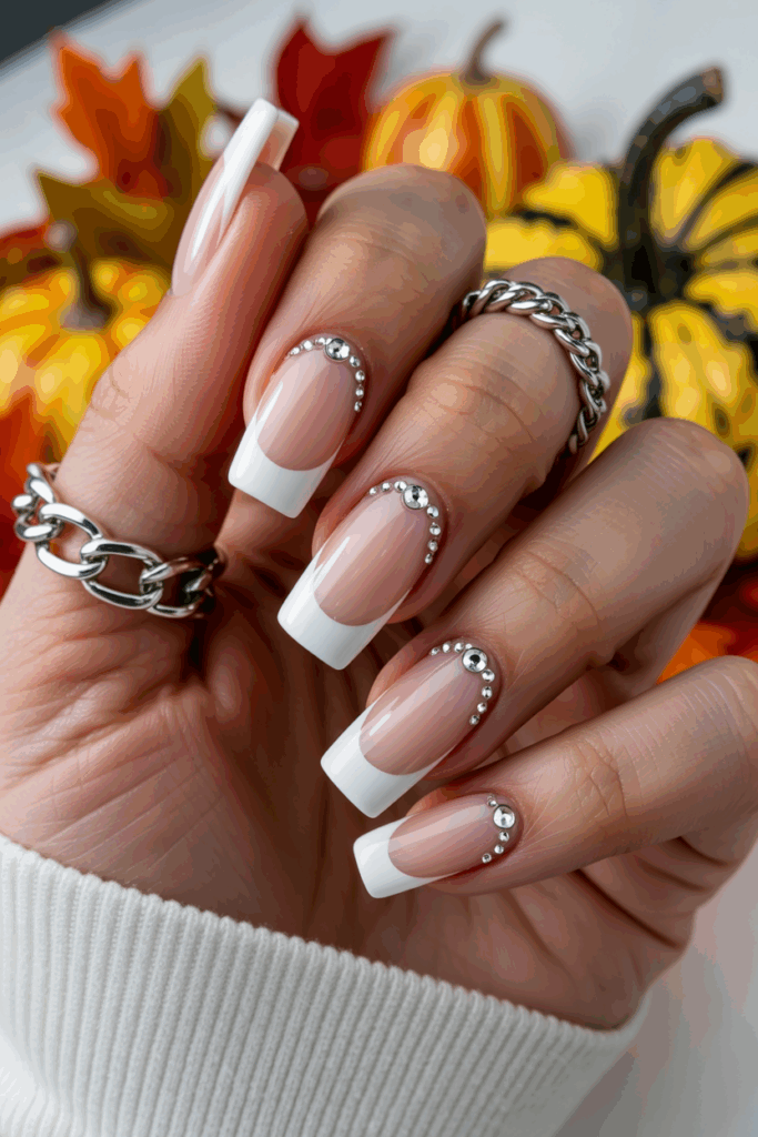The classic French tip gets a fresh update with silver rhinestones. These small gems add sparkle without overpowering the clean design.