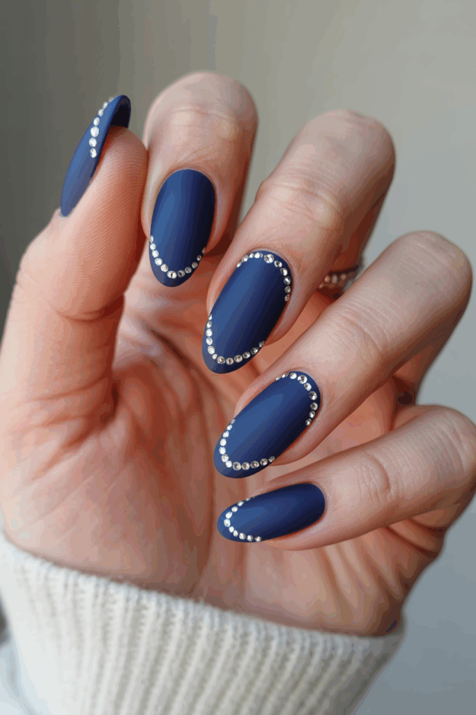 9) Matte Navy Blue Nails with Diamond Rhinestone Tips