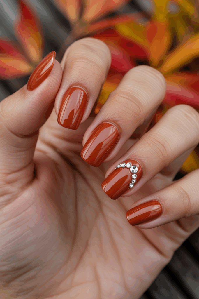 10) Glossy Rust Orange Nails with Minimal Rhinestone Placement