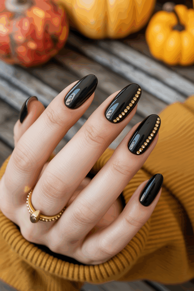 13) Jet Black Nails with Bold Gold Rhinestone Lines