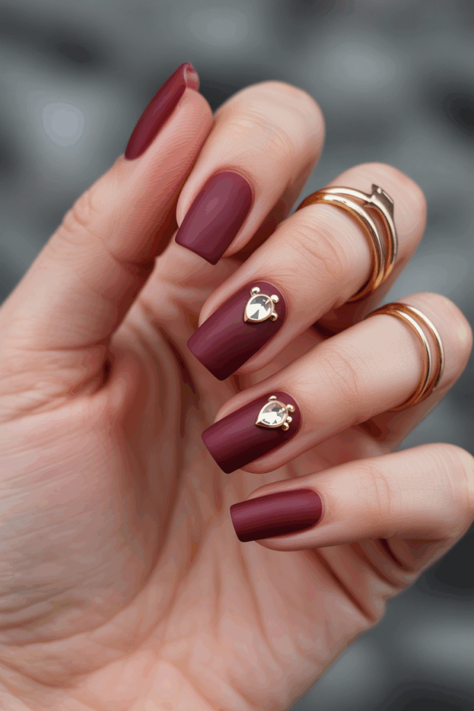 Matte burgundy nails offer a rich, elegant base perfect for fall. Adding gold rhinestones creates a subtle yet striking contrast. The combination balances warmth with a touch of luxury, making it suitable for both casual and formal settings.