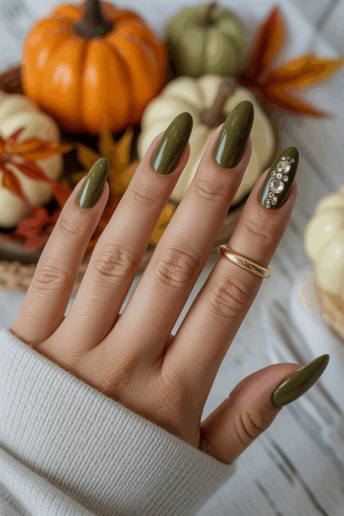 This look features a smooth satin finish in a deep olive green. The ring finger stands out with small rhinestone clusters near the cuticle. This adds a subtle sparkle without overpowering the matte texture. It is a stylish choice for fall.