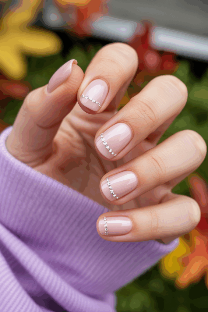 Sheer pink nails offer a soft and elegant base for fall manicures. Adding thin stripes of rhinestones brings a delicate sparkle without overwhelming the look. This design blends simplicity with a touch of glamour, making it suitable for both casual and formal occasions.