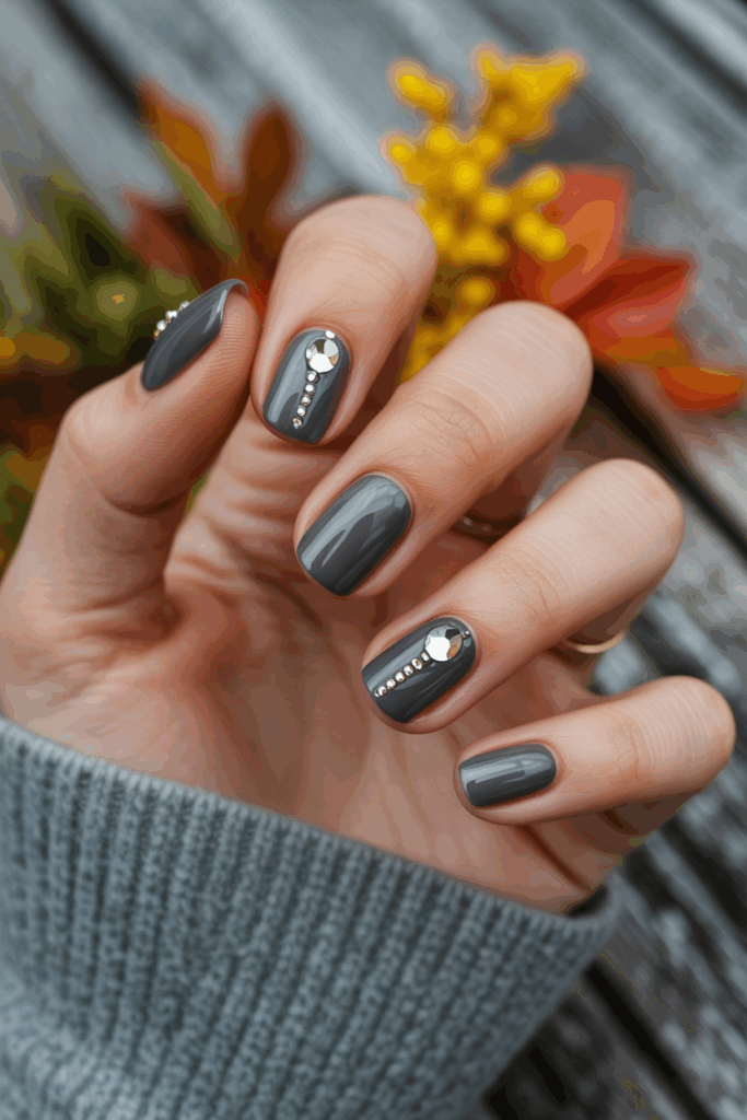 Smoky grey nails offer a stylish, neutral base for fall. The asymmetrical rhinestones add a modern twist by placing gems unevenly on each nail. This design balances subtlety with a bit of sparkle, making it suitable for various occasions.