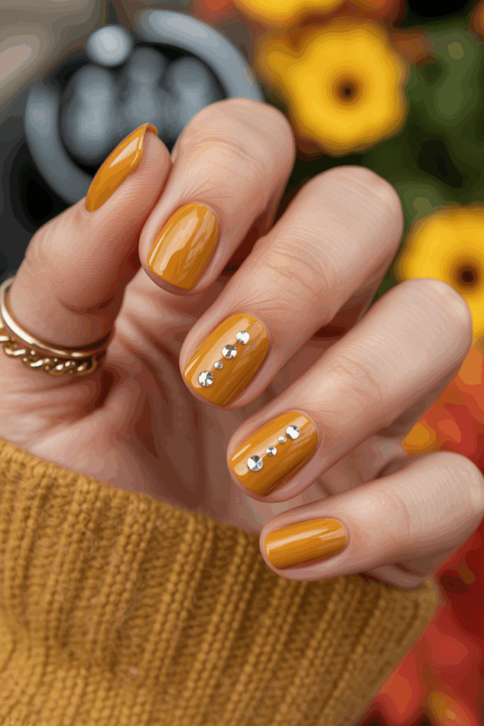 14) Warm Mustard Nails with Tiny Clear Rhinestone Dots
