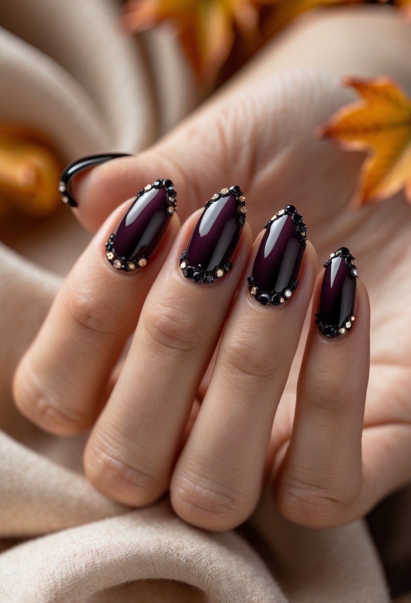 This design uses a rich deep plum base that suits fall well. Small black gemstones are placed near the nail cuticle to add a subtle shine. The contrast between the dark plum and black gems gives a modern and elegant look.