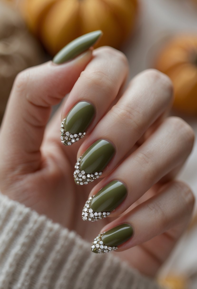 Olive green nails offer a rich, earthy tone perfect for fall. Adding small silver rhinestones creates a subtle shine that catches light without overpowering the look.