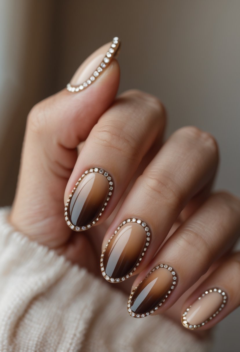 8) Ombré Brown to Beige Nails with Rhinestone Borders