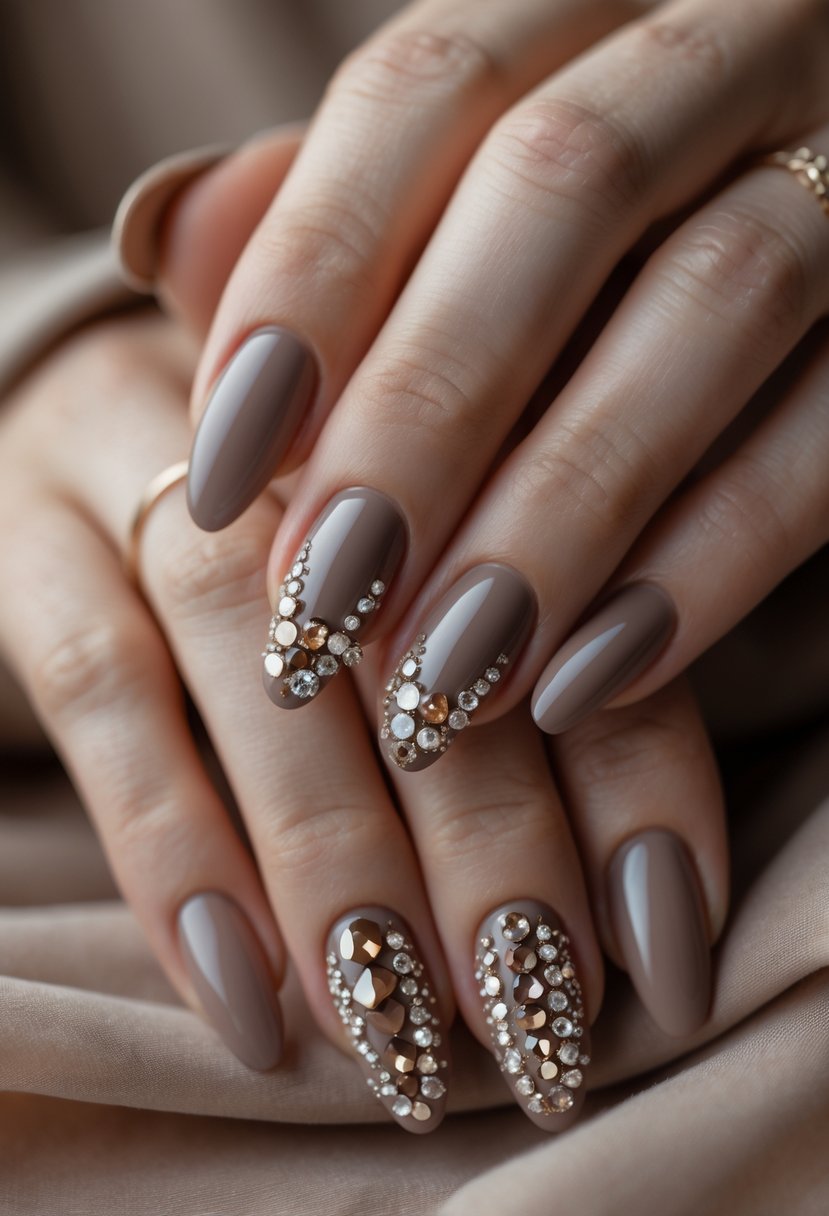 11) Soft Taupe Nails with Mixed Size Rhinestone Patterns