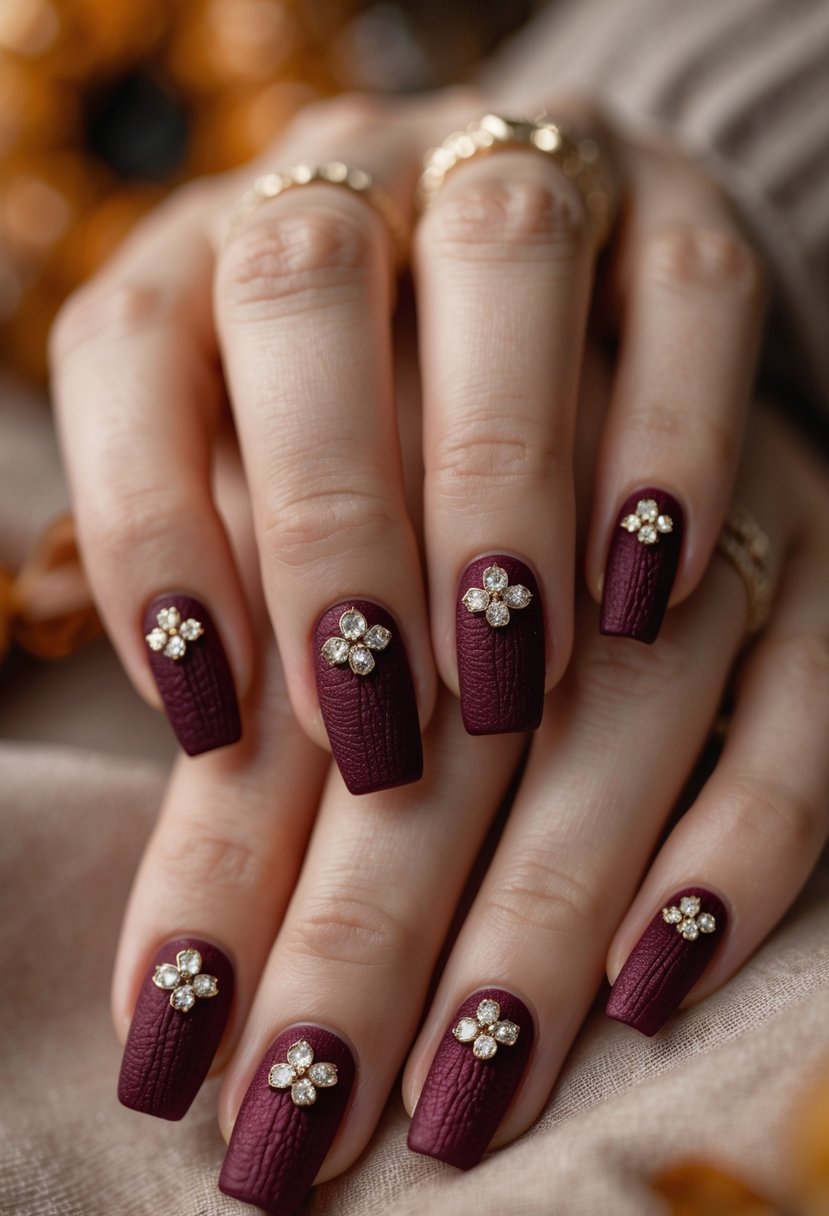 15) Textured Maroon Nails Enhanced with Rhinestone Flowers