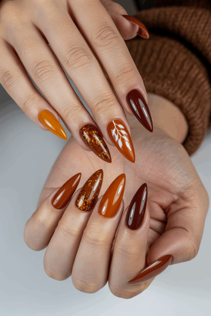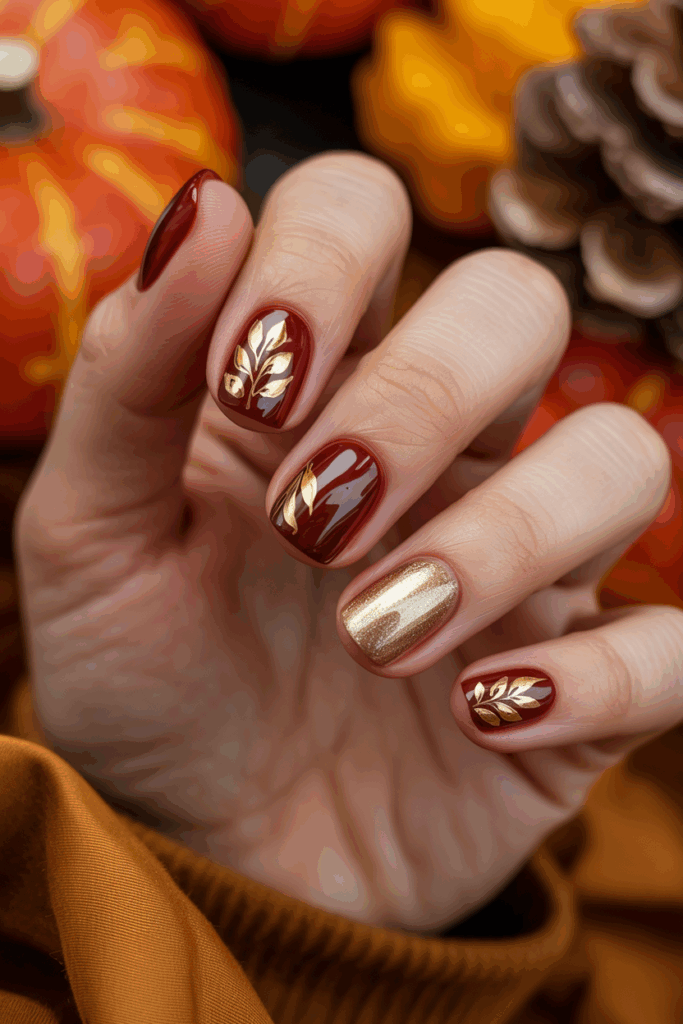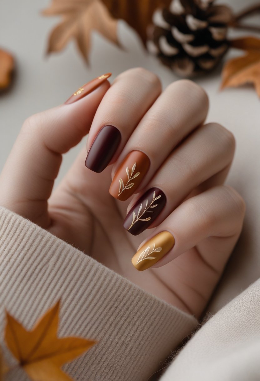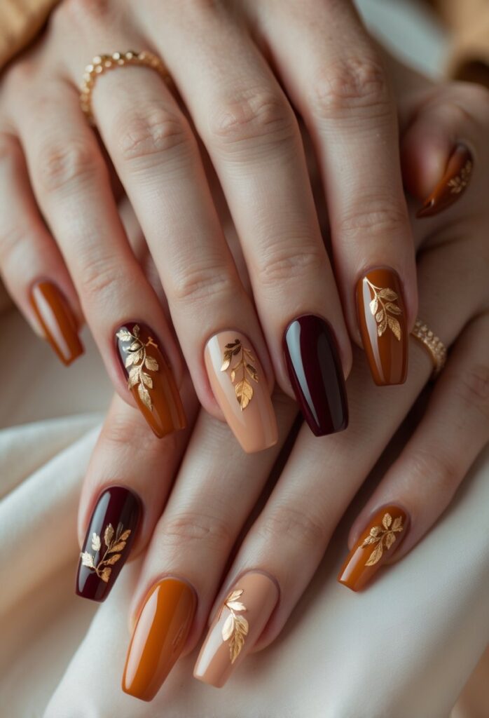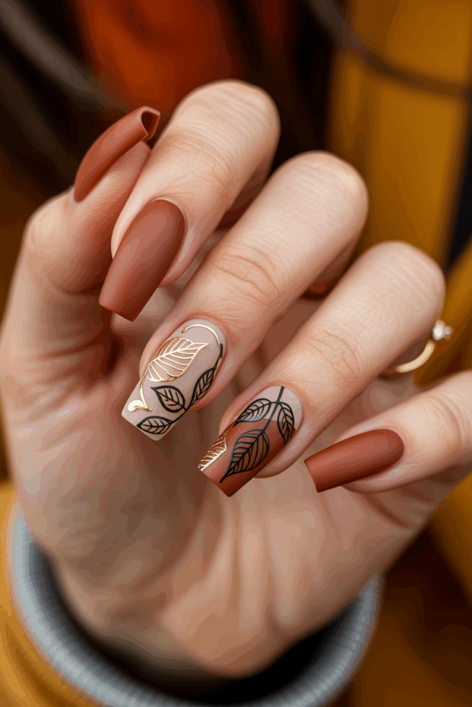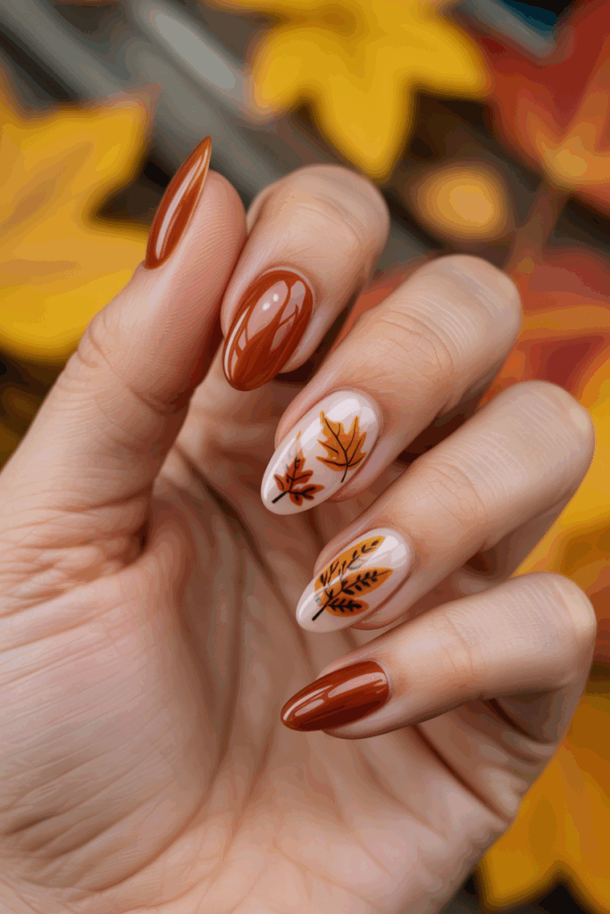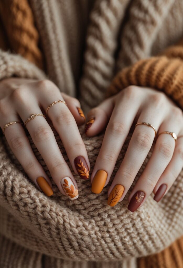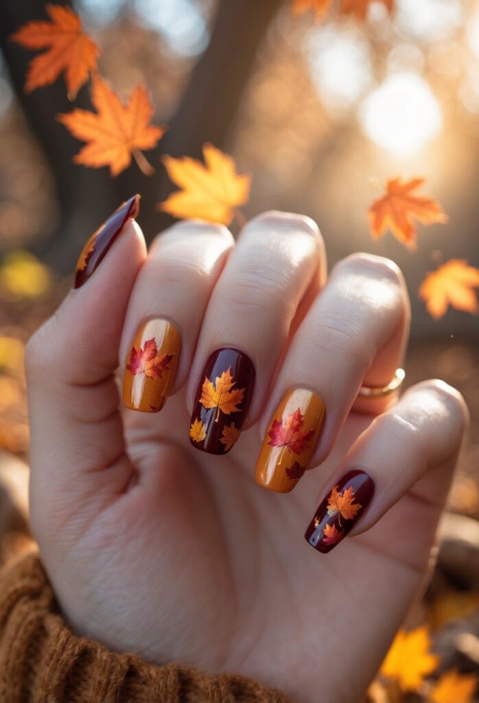 Leaf motifs are central to nature-themed fall manicures, capturing the intricate details of maple, oak, and birch leaves. Designs often feature warm colors like burnt orange, deep red, and mustard yellow, applied with precision to highlight veins and edges.