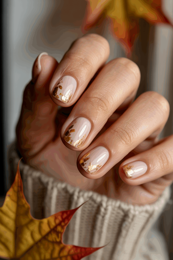 Using a clear top coat seals the gold leaf and ensures durability, preventing quick wear or peeling. This technique balances sophistication with the festive spirit often sought in autumn nail styles.