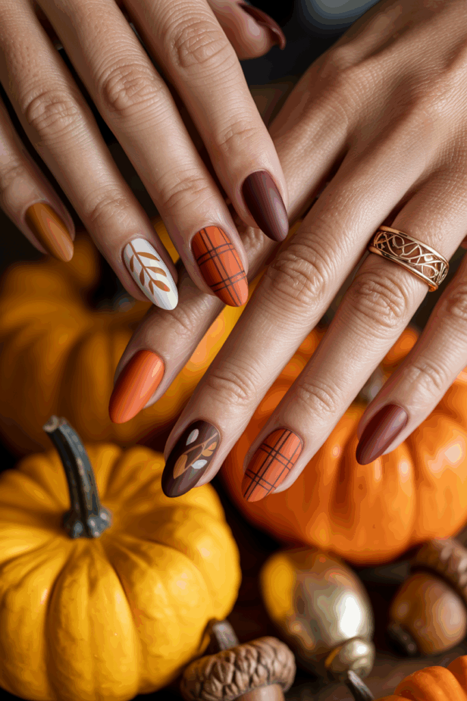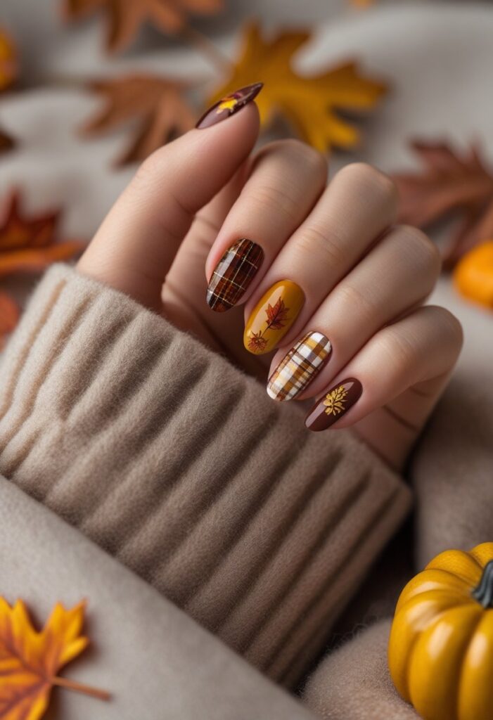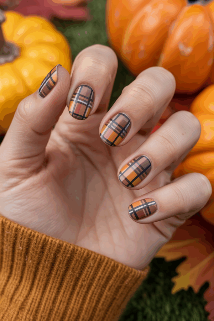 21. Plaid nail art in autumn colors channels classic flannel vibes.