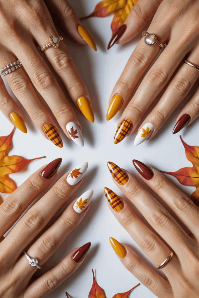 Plaid and checkered nails highlight the season’s affinity for cozy fabrics with crisp lines and contrasting colors. Popular palettes include deep reds, forest greens, mustard yellows, and browns.