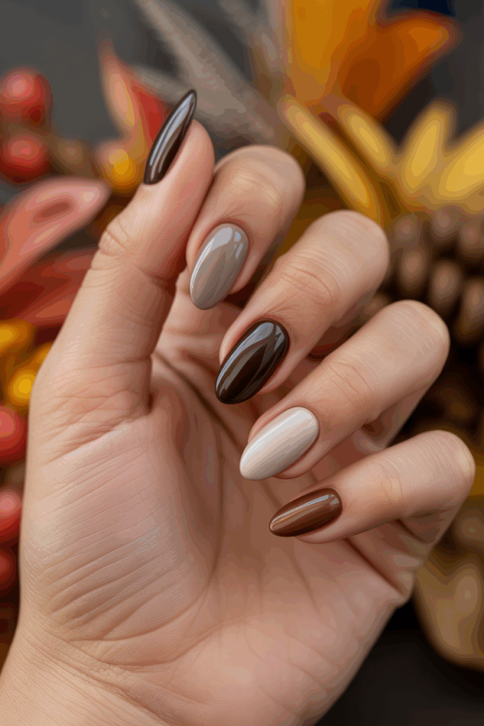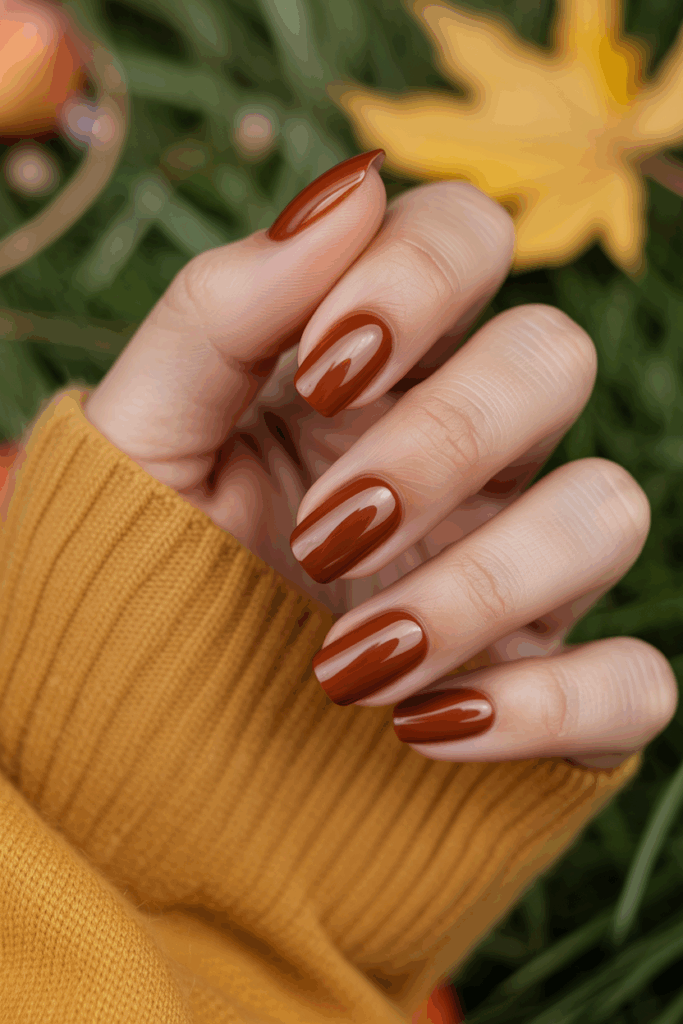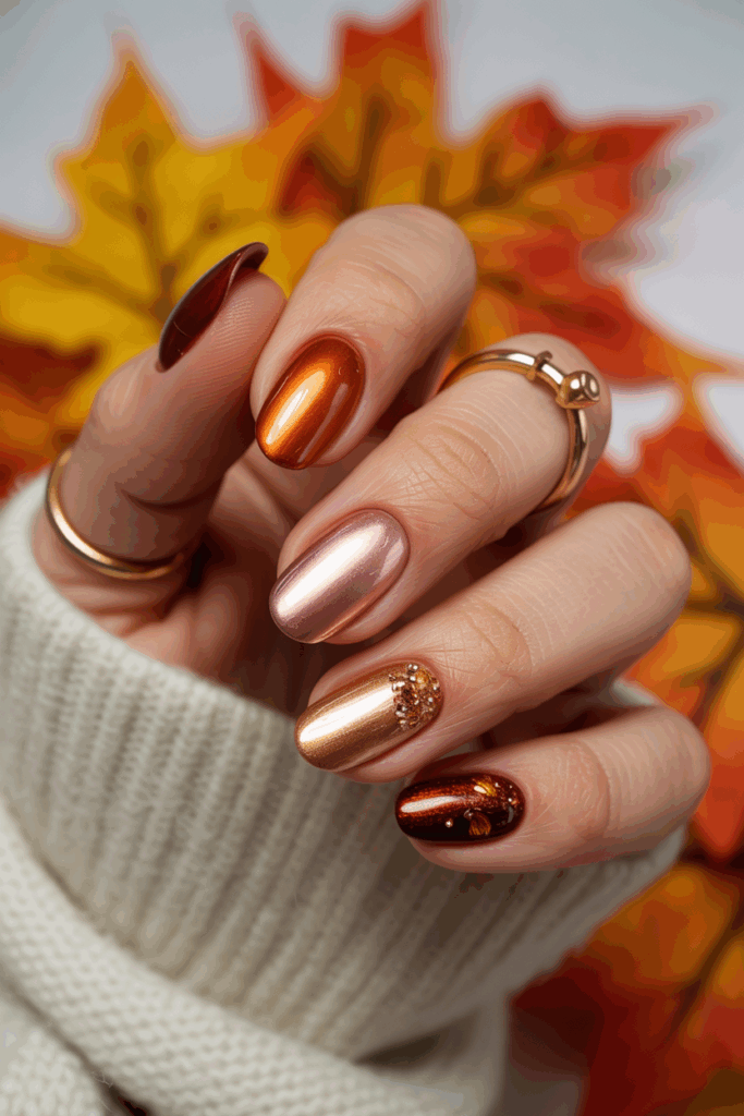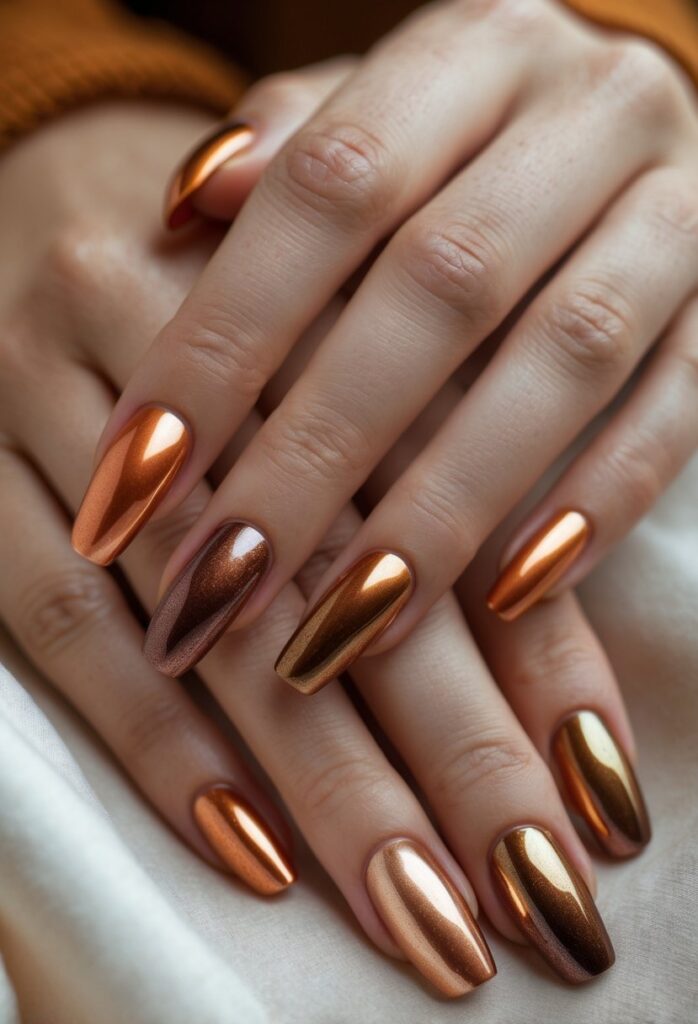 Bronze and copper shades capture the earthy, warm tones of autumn leaves. These colors work well on both short and long nails and pair smoothly with matte or glossy finishes.