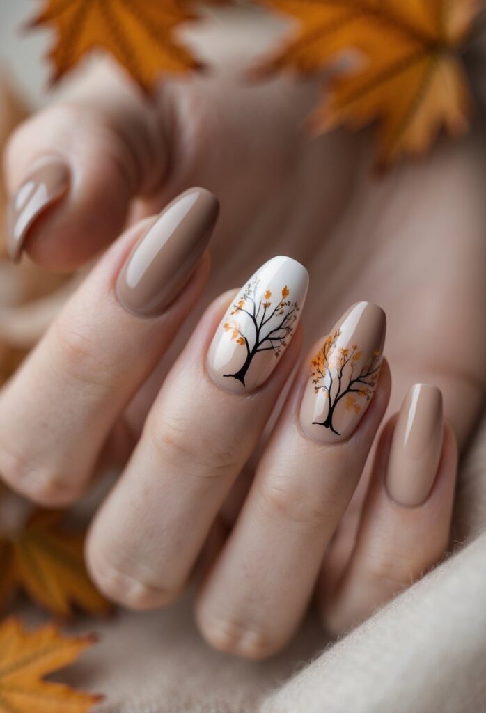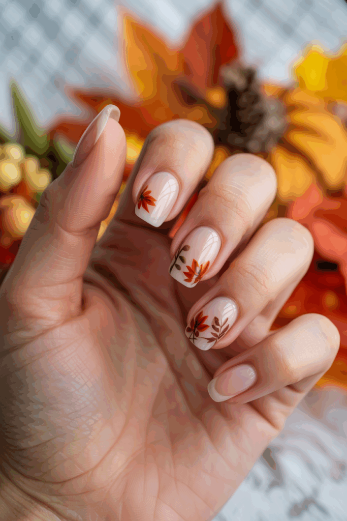 Neutral tones like cream, taupe, and soft beige create a warm base that pairs well with fall hues. Small accents such as thin metallic lines, delicate dots, or faint leaf patterns add interest without overwhelming the design.
