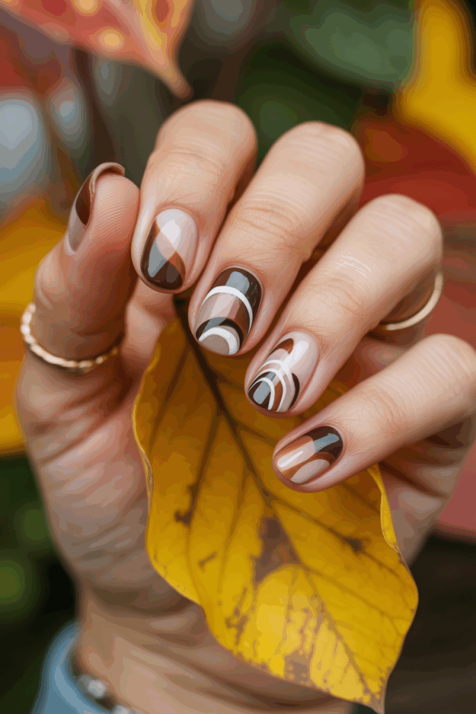 Abstract fall nail art uses shapes and colors that evoke the season without depicting specific objects.