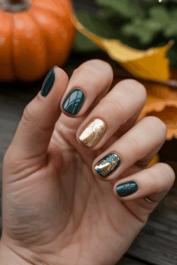 Emerald green adds a jewel-tone pop amid darker shades, making it a bold but fitting choice for fall nails. This rich green complements typical autumn colors like mustard, brown, and burnt orange.